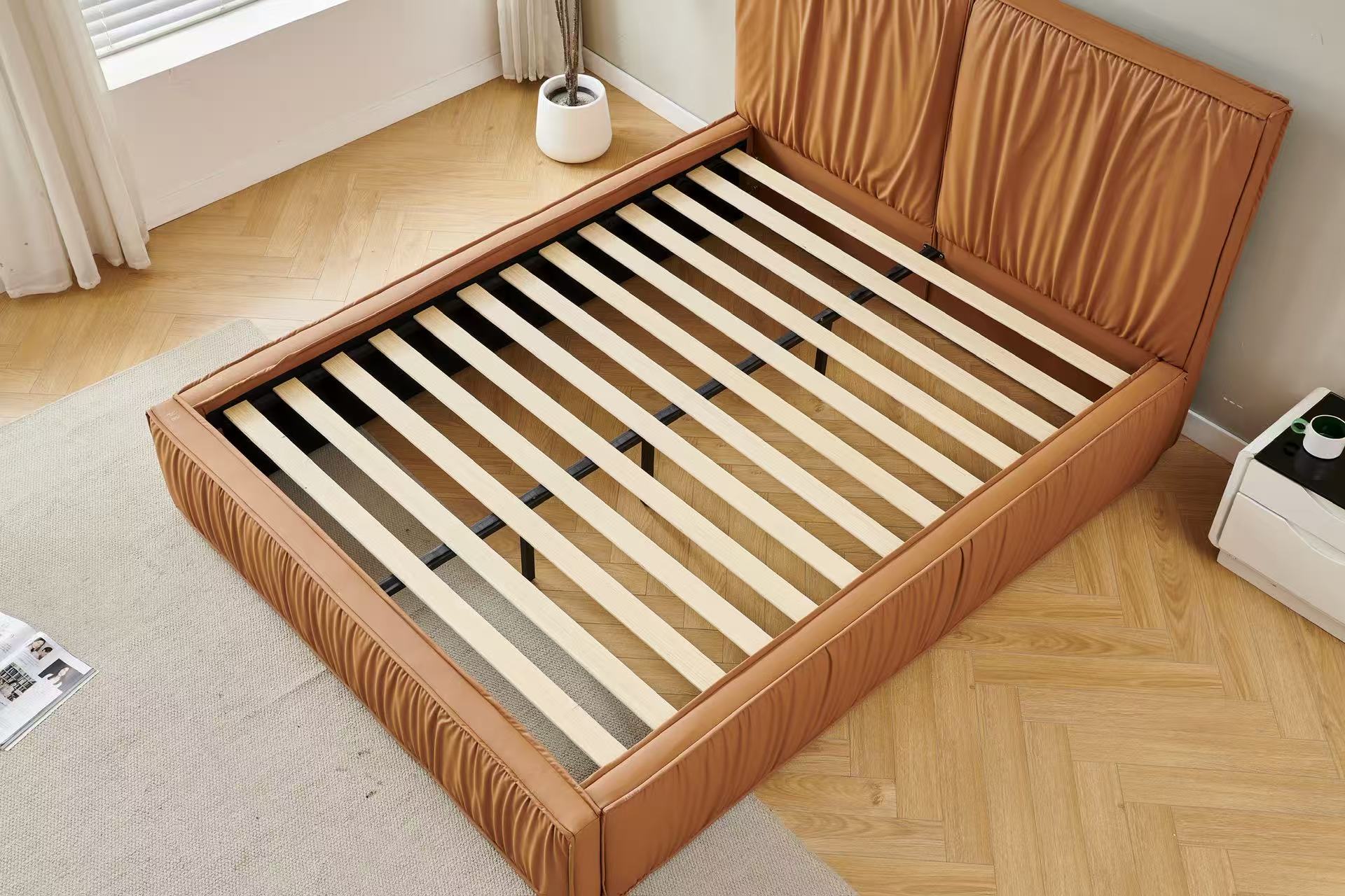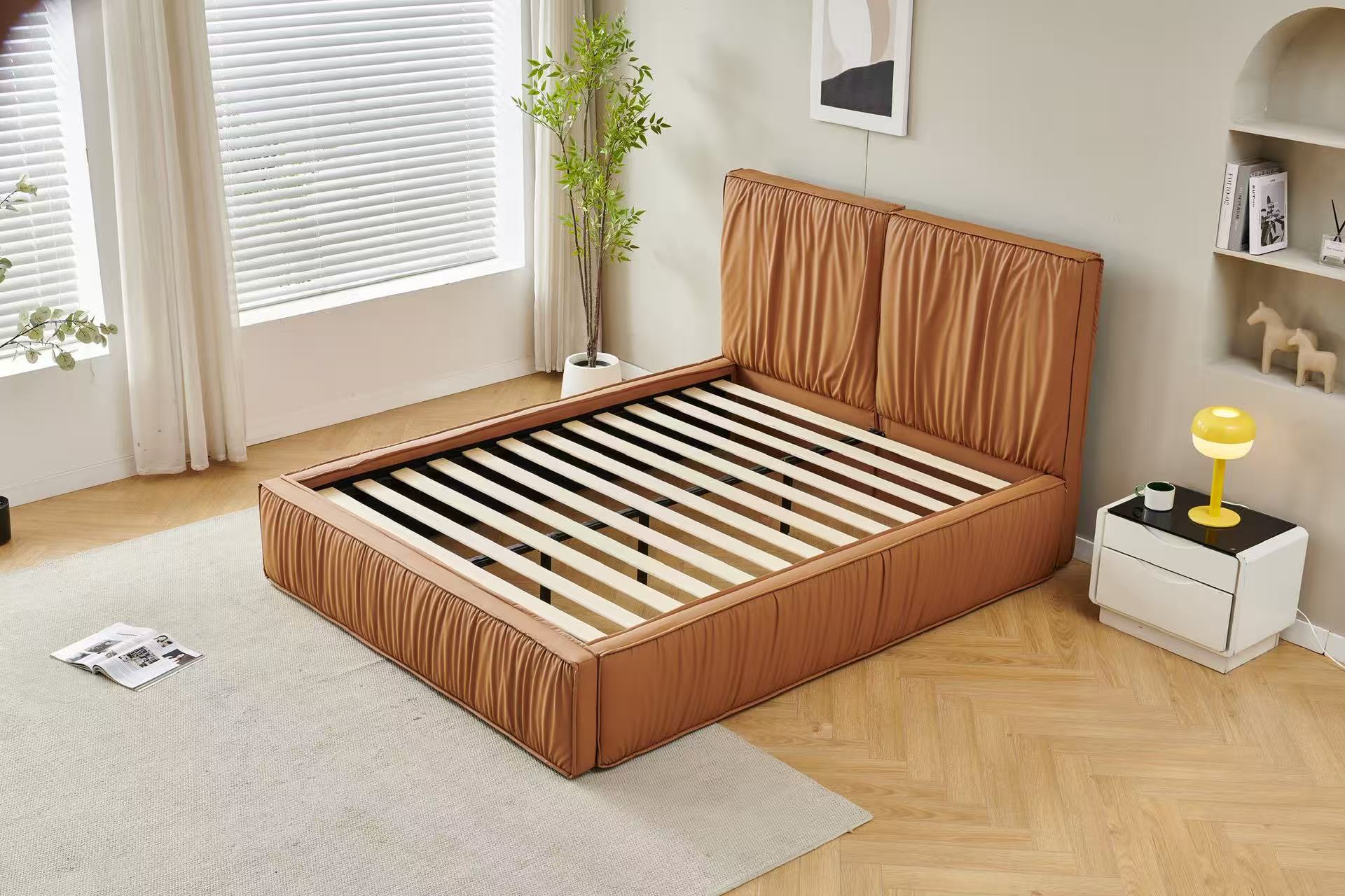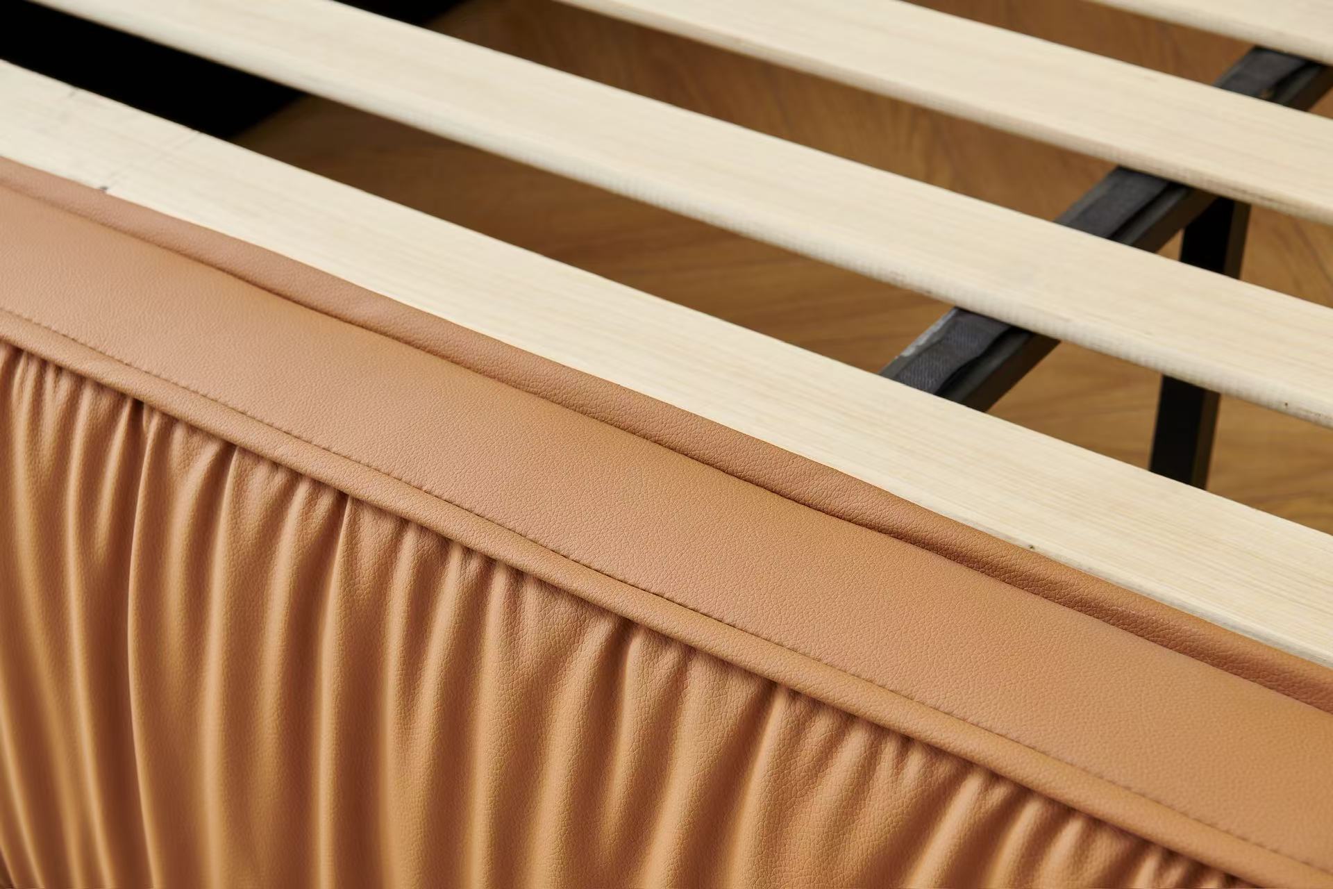 Materials: pine wood frame, plywood slats, polyester upholstery, high-density foam padding, ABS plastic legs