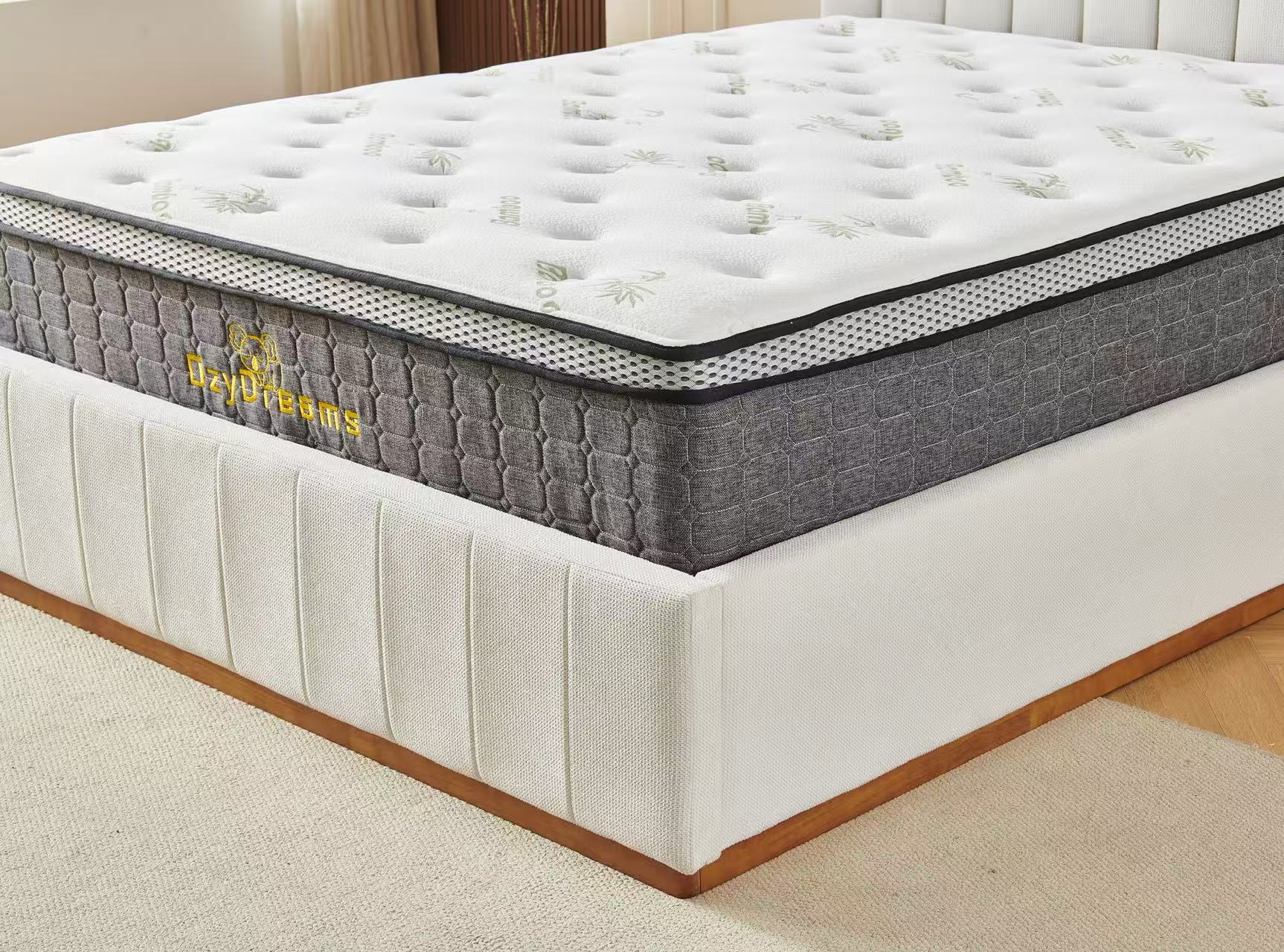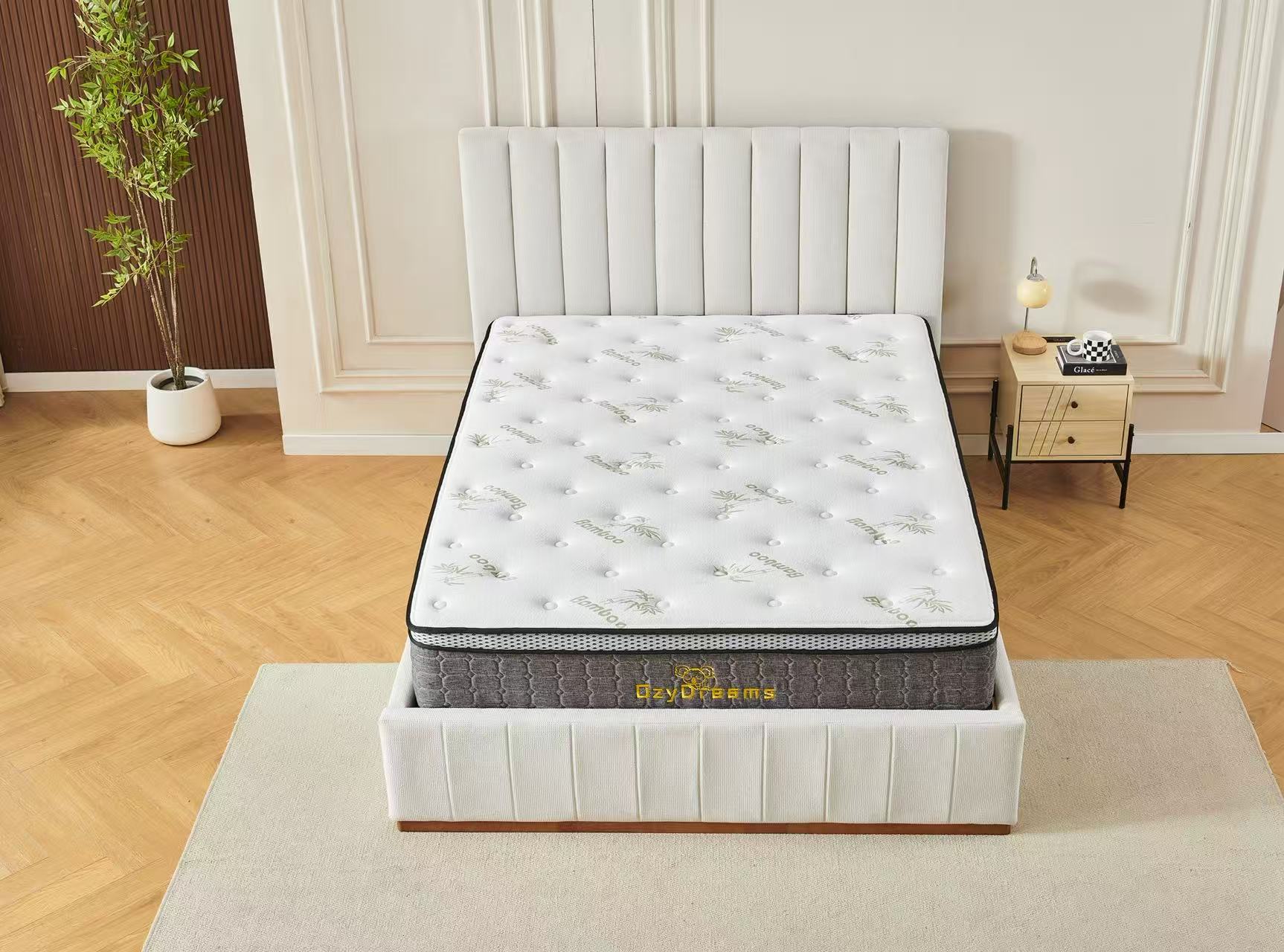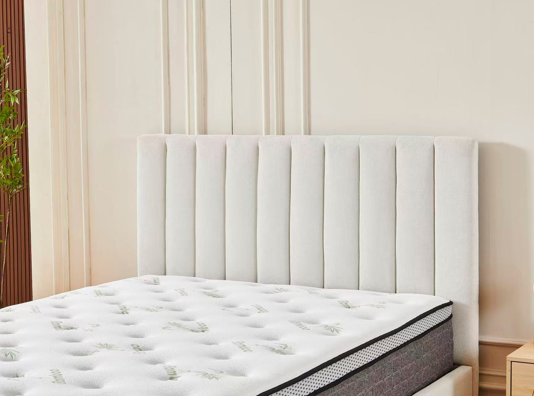 Beige Channel Bed Frame + White 30cm Pillow Top Bamboo Mattress