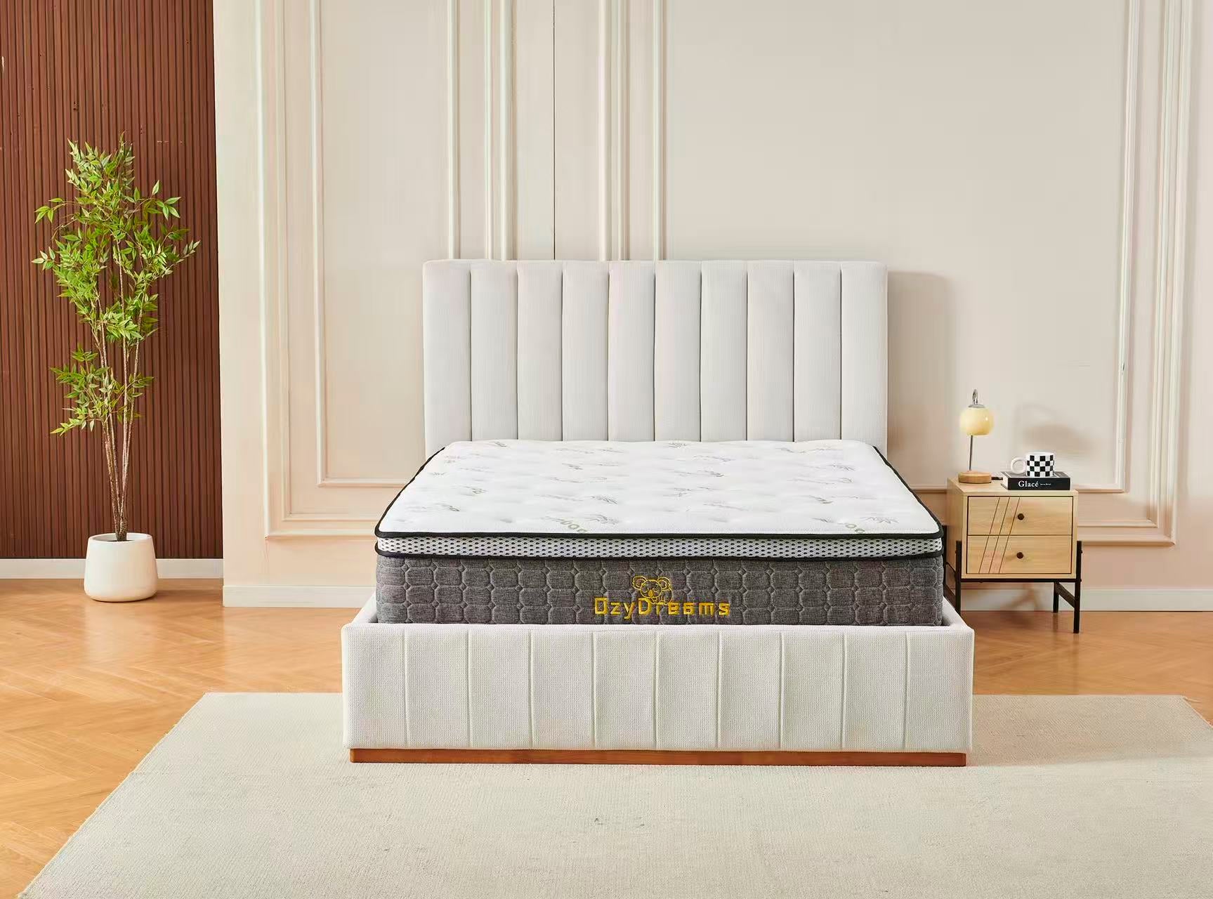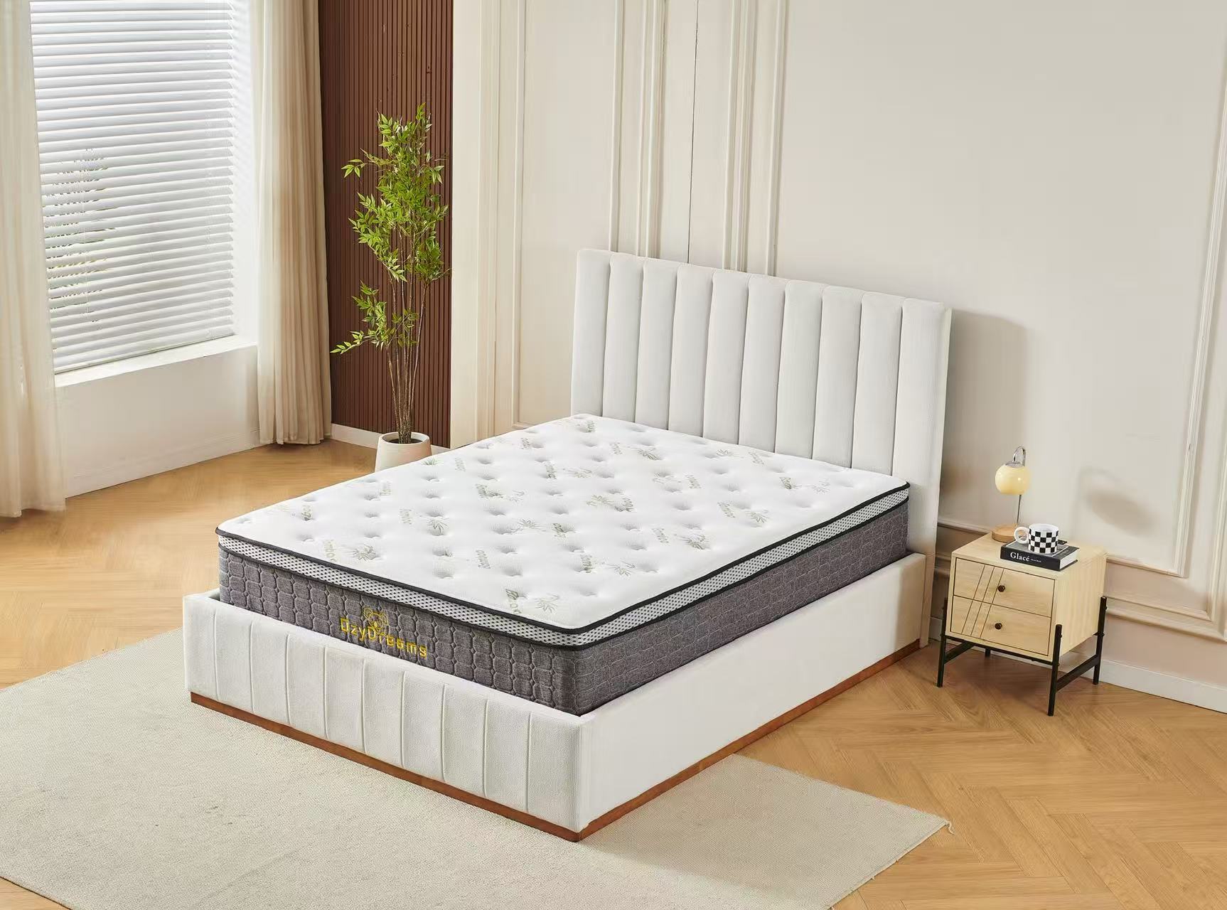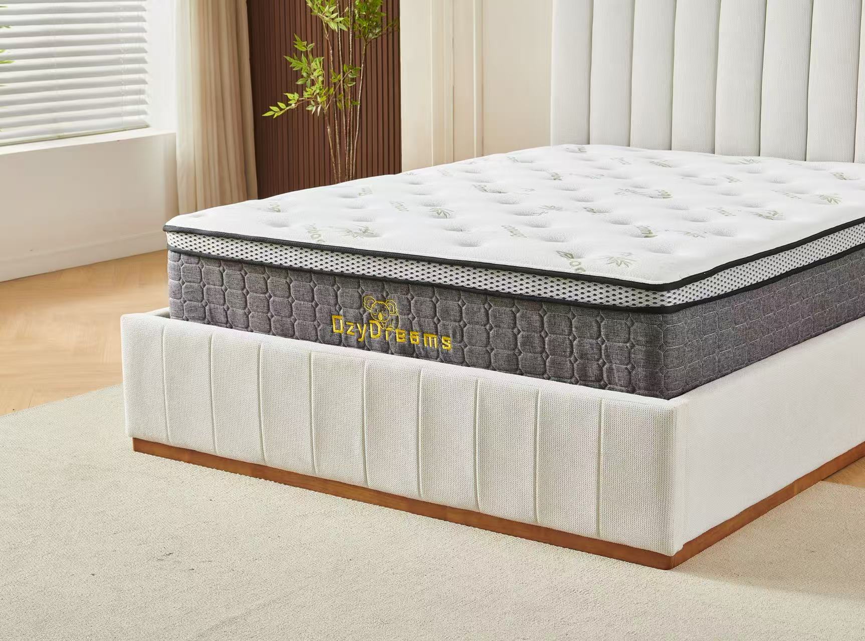 Beige Channel Bed Frame + White 30cm Pillow Top Bamboo Mattress